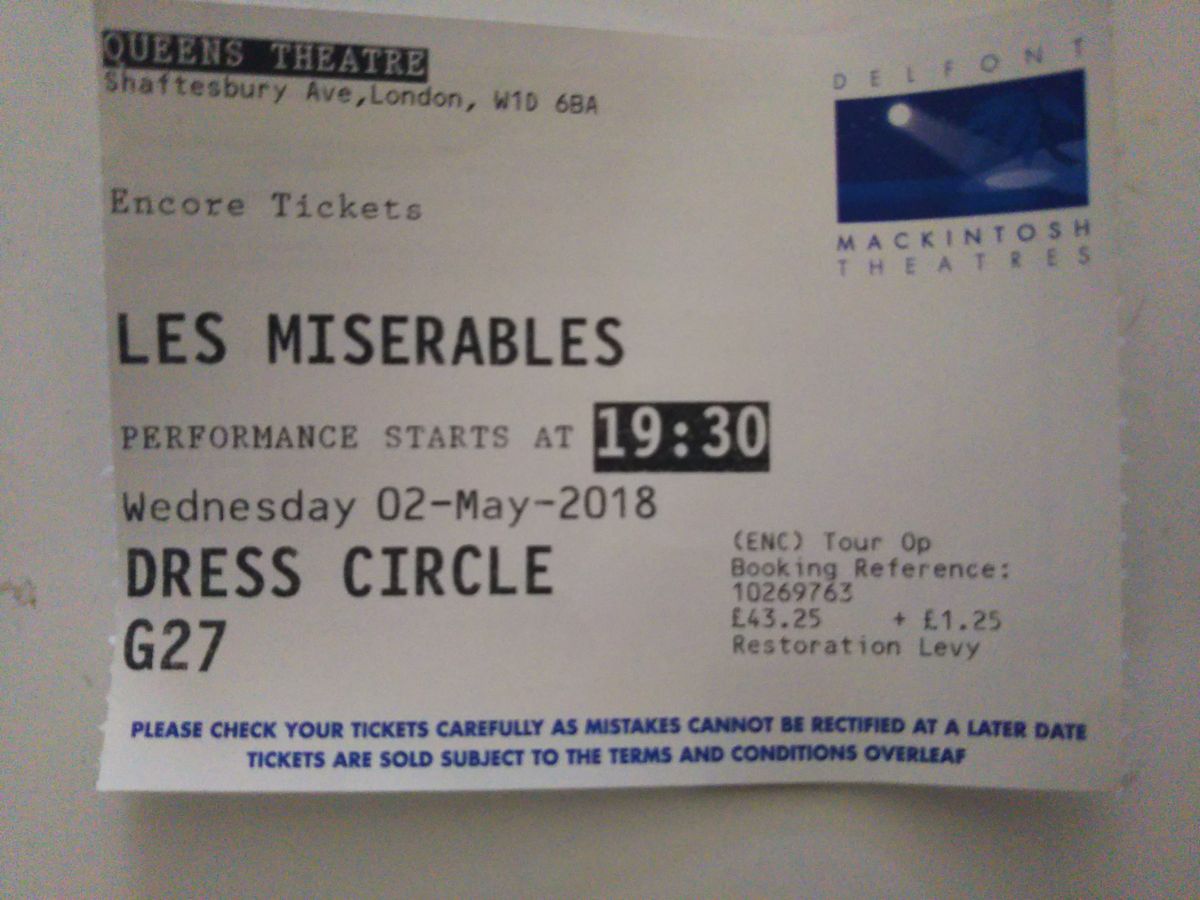 今回、初めてミュージカルを見るというのと、せっかくイギリスに滞在して居るからには、自分の手の届く範囲で一番良いチケットをと思い購入しました。当日までどこの席かは分からなかったのですが行ってみると、一階席の前から二列目というびっくりするくらい良い席で観劇できました。舞台との距離がとても近かったので、役者さんの表情の変化、声量の凄さを本当に近くで見ることが出来ました。