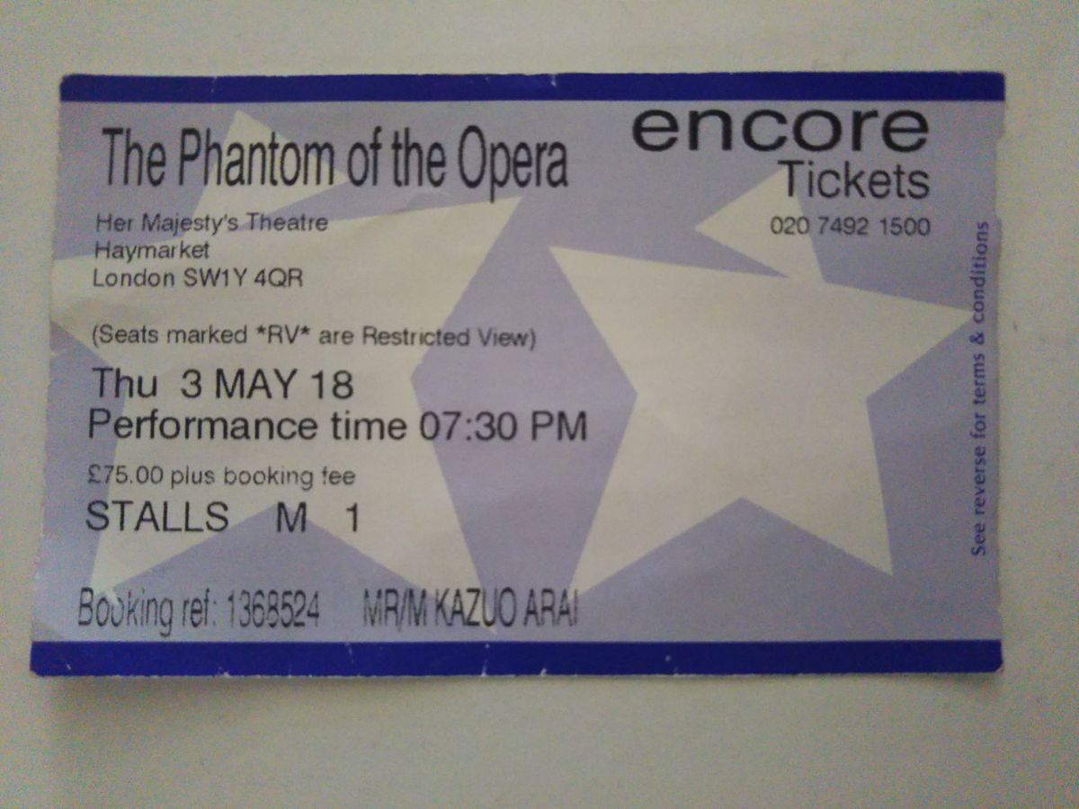 オペラ座の怪人チケットを予約しました。1階席なのはよかったですが、少し舞台から遠かったのが残念でした。ミュージカル自体は楽しめました。