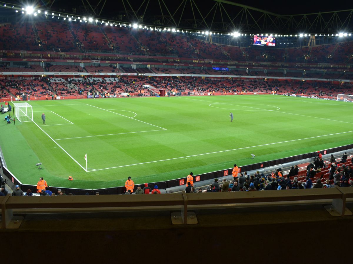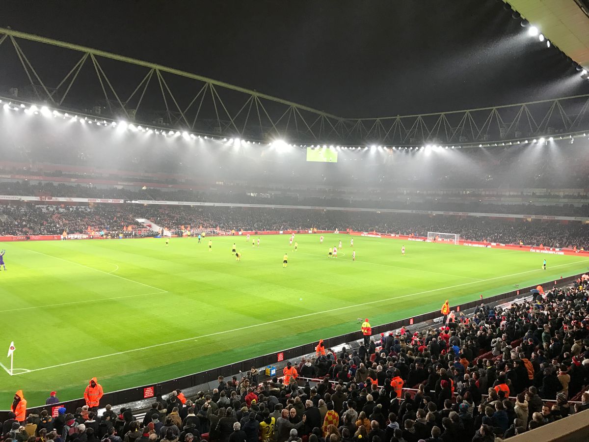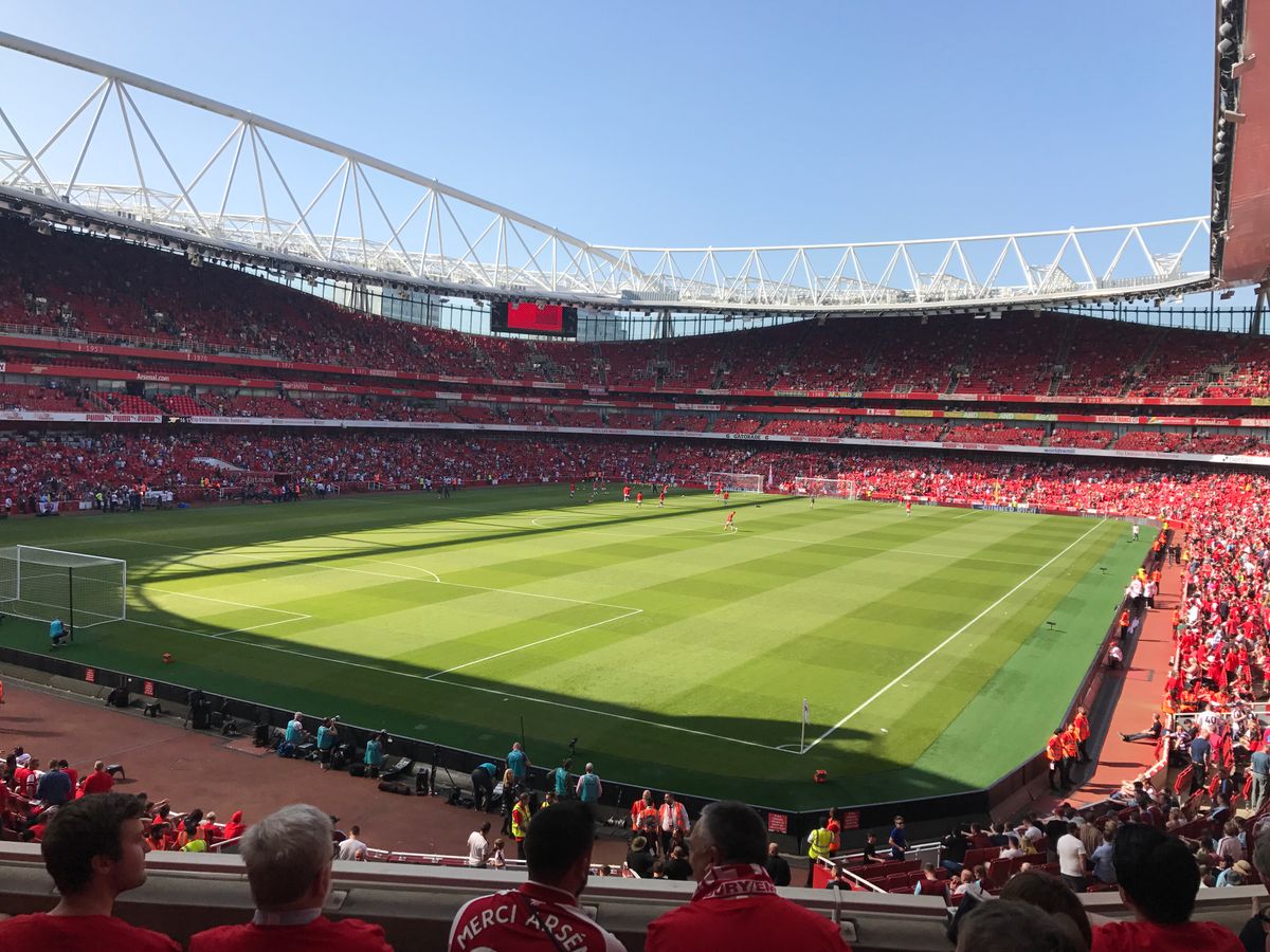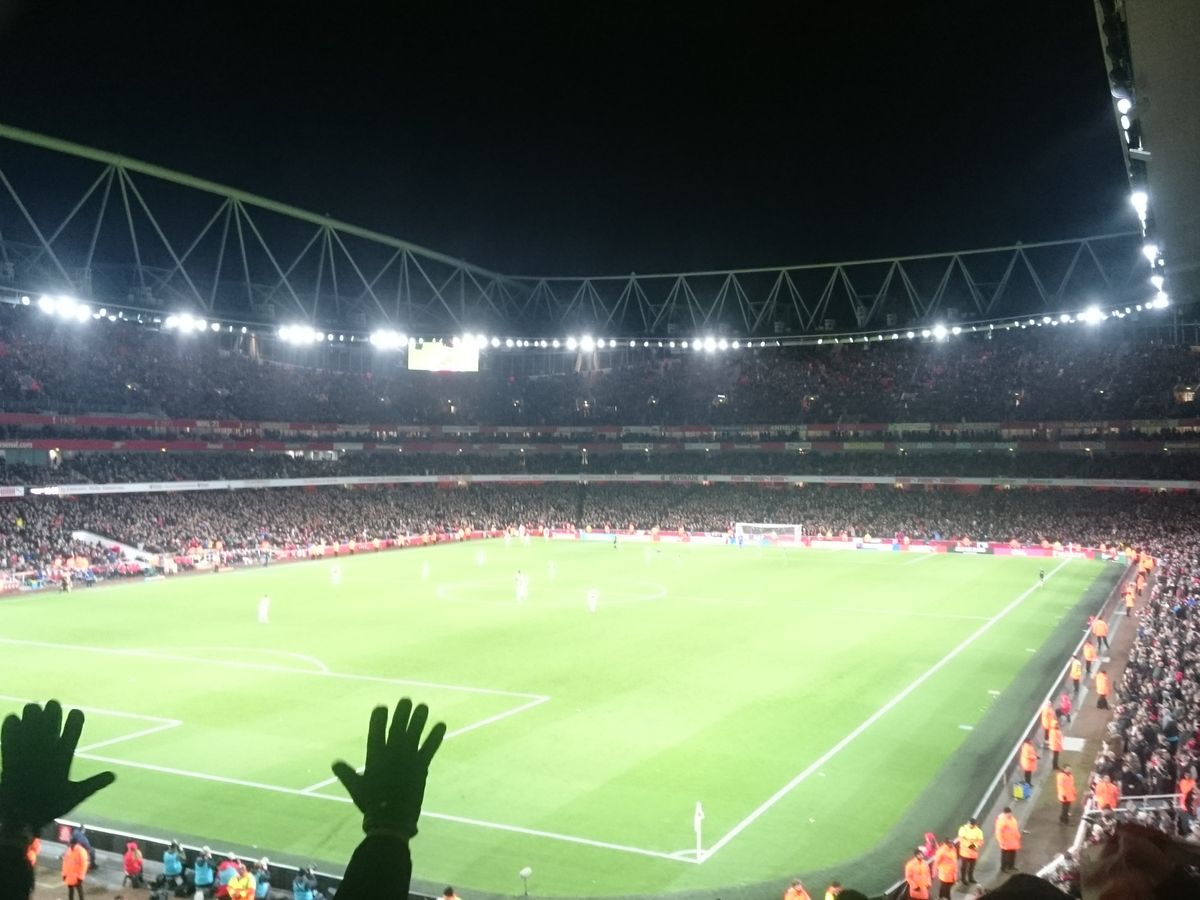 席はアウェー側スタンドのゴール裏。クラブレベルなので、周りは小金持ち?なアーセナルサポーター。野太い声を上げ続けるアウェーサポーターを上と下のスタンドに見ながらの観戦です。