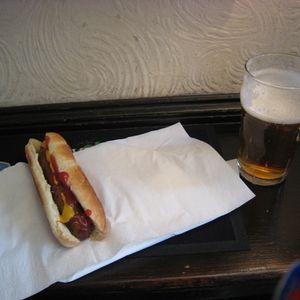 宮殿を後にした我々はロンドン市内の中心的な広場のトラファルガー広場近くに、ガイドさんお勧めビールとホットドッグが美味しいイングリッシュパブに行きました。値段もビールとホットドッグで1人6£程で軽い昼食と休憩になりました。