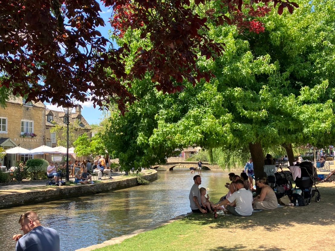 ボートン・オン・ザ・ウォーター到着は12時半。各自思い思いに昼食を取ります。この日は気温30度と暑い日でしたが、カラッとした木陰は涼しく、川縁に腰をおろしサンドウィッチを頬張る。川遊びする子ども達や犬を眺めながらのんびりと過ごす。