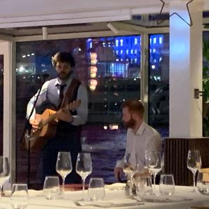 花火をみるポイントに移動するまでは船内ではライブが行われ、川岸の夜景と共に楽しみました。