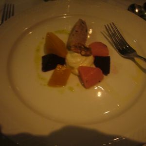さて、肝心の料理のなのですが、アミューズブーシュとシャンパンで乾杯。その後、スモークサーモン、パテを前菜で、魚(たら)チキンをそれぞれ注文し、料理の合わせて、白ワイン、赤ワイン、そしてデザートワインが出てきます。それぞれ、中々のセレクションで、薄暮、そして夜景に変わっていくロンドの夜景を堪能しました。