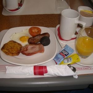 今回は、バージントレインの1等車両を利用しましたが車内で食事が出ます。シートも広々豪華です!少し高くても1等車両をお勧めします!ロンドンからオクセンホーム駅まで約2時間半の電車の旅です。行きの食事は、朝食メニューです。電車がロンドンユーストン駅を出発するとすぐにオレンジジュースがサービスされます。その後、コーヒーor紅茶がサービスされます。続いて食事のメニューを3種類から選択です。お勧めは、イングリッシュブレックファーストです。ソーセージ、ベーコン、目玉焼き、ポテトにトーストです。トーストは、好きな枚数取れますからお腹が空いている人は、たくさん頂きましょう!ジャムとバターもたくさん頂きましょう!コーヒーと紅茶は、お替り自由です!(遠慮なく頂きましょう!)