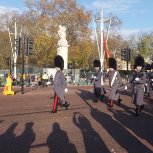バッキンガム宮殿の衛兵交代式は、さすがにベテランさんだけあって間近で見えるスポットに案内してくれました。ただ、まさに衛兵さんの宿舎?からの出発地点だったため、行進していくのが見えるだけで宮殿前で交代しているところは見えなかったのが残念。