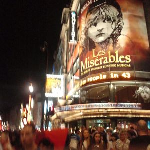 2014年7月4日ロンドン市内観光夕食後 19:10いよいよクイーンズシアター到着。25年前から海外出張で横目に眺めていた憧れのあの看板の劇場についに入った! 客席はほぼ満席。今か今かと公演開始を待ち、繰り広げられる舞台に圧倒された。英語の歌詞、セリフは完全には理解できないものの良く知ったストーリー問題無し。言葉を超えた舞台の歌、演技に圧倒され涙が抑えきれませんでした。会場はどんどん盛り上がり拍手の嵐、最後はスタンディング・オベーションで3時間の至福の時間が終了。本当に幸せなひと時でした。幕間に他の観客と国際親善、感動を分かち合うのも楽しい時間でした。世界は一つ、最高!