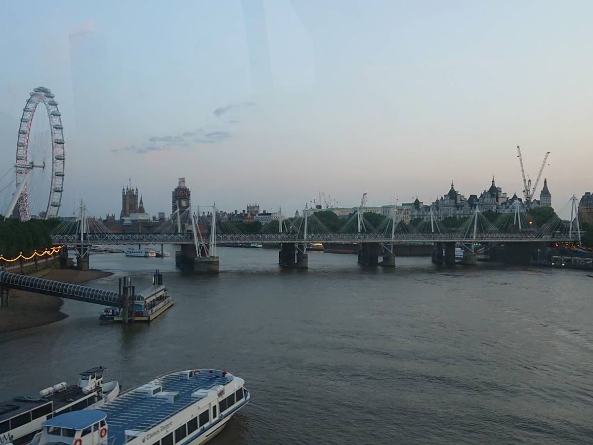 7月6日で2030出発にしましたが、最初は明るかったのですが、徐々に暗くなって変化を楽しめました。出発してすぐにトンネルを通過するのですが、2階席でトンネルが迫ってきて予想外に面白かったです。ロンドンブリッジを見上げながら通過するのがなかなか良かったです。