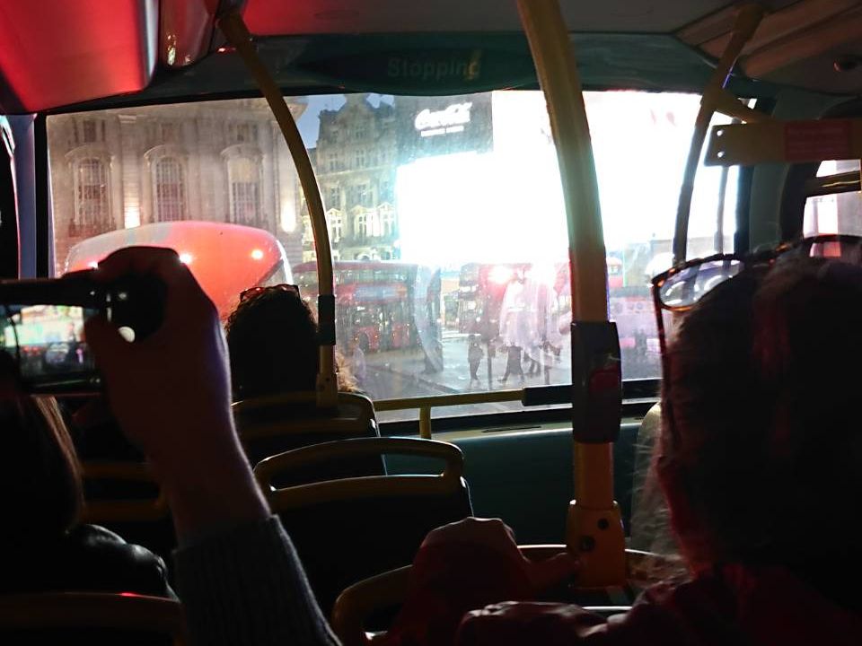 19時40分集合のバスでしたが、1階には誰もおらず、みんな2階にたくさん乗っていました。前の方だけ屋根があり、後ろの方は屋根がなかったので、わたしは前の方に乗りました。後ろの人は、風もあり、また夜なので気温も低くとても寒そうでした。屋根のないところに乗るには羽織るものを持って行った方がいいと思います。ガイドさんがずっと話し続けているため、うるさくしていると怒られます。前に小さい子供が5人いて、お母さんと子供がガイドさんに静かにしろと何度も何度も言われていました。休憩やバスが止まったりすることは一切なく、左側に座りましたが左側しか写真が撮れず、右側は全然撮れませんでした。でも観るところは左側の方が多かったです!1人参加でしたが、とても良かったです!