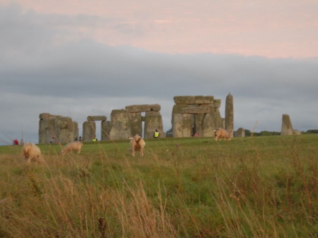 夕日観賞のツアーは、ストーンヘイジを見学してバスに戻ってくるのが日没後で閉園となってしまうため、ビジターセンターのショップで先に土産物の買い物タイムとなります。日没に合わせ上手く時間調整し、いよいよ見学の時間となりました。ストーンヘイジまでは距離があるため、近くまで敷地内を専用バスで移動します。広い草原の中をバスが走り出すと多くの羊がのんびり草を食べている光景が広がり、その先に忽然と現れたストーンヘイジの巨石群が目に飛び込んできました。