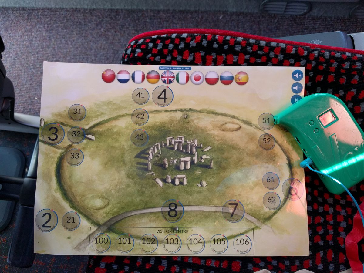 ガイドよりお受け取りいただき、常に首に掛けてご移動されていたかと存じます。ストーンヘンジのオーディオガイドも、こちらのVoxオーディオガイドとお渡ししたマップ(地図)をタッチしながらの見学となります。そのため、ストーンヘンジにてオーディオガイドを借りる列に並ぶことなくご入場いただけます。