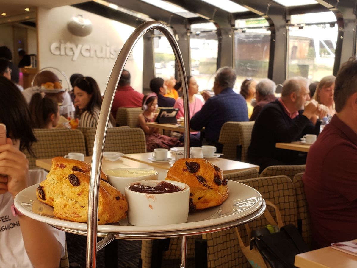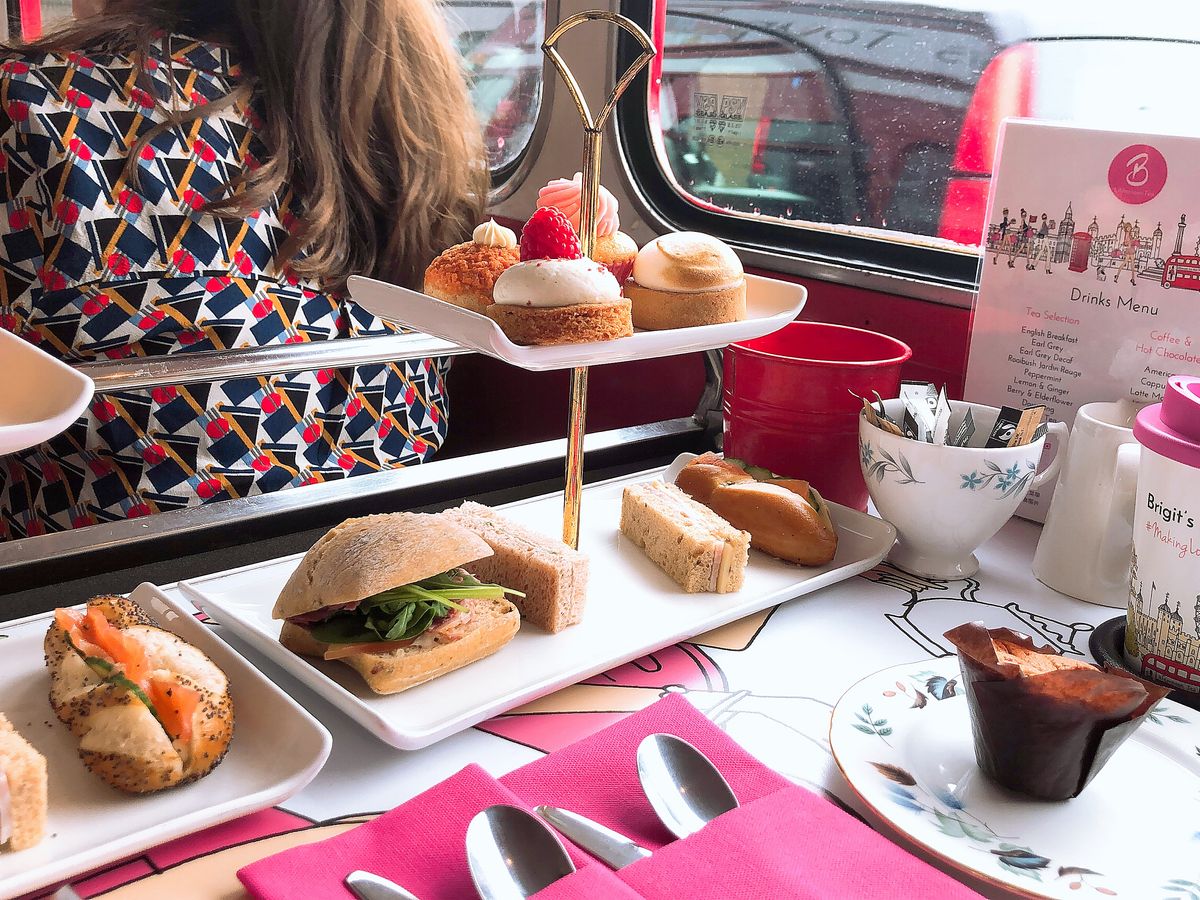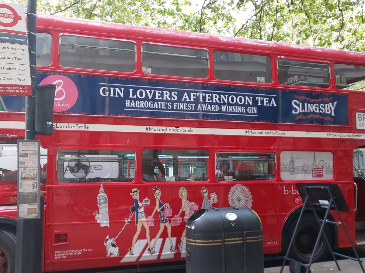 一階でしたが景色を楽しめました。参加者が多く二台のバスでした。受付はギリギリまで待つように言われるので時間を過ぎて全員の受付が終了する為不安になりますが、最初から座席は指定されています。英語は殆ど分かりませんでしたが通っている場所の説明が流れているようでした。ガイドさんが飲み物のお代わりを聞いてくれたり持ち帰り用の箱をくれたり親切でした。最後に気持ちをチップで払う用です。慣れていないので入れそびれましたがコインを缶に入れているようでした。サンドイッチもマフィンもスイーツもスコーンも美味しかったです。トイレがないので心配でしたがあっという間の90分でした。通りすがりの観光客にも注目されていたので走りながら宣伝にもなっていたようです。