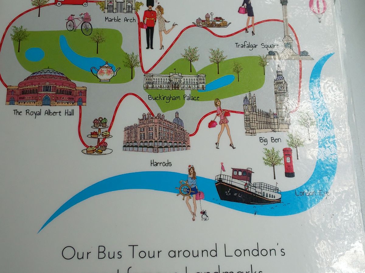 バスはトラファルガー広場を出て、バッキンガム宮殿の近くを通り、ハイドパークの周りをゆっくり走って約90分間です。