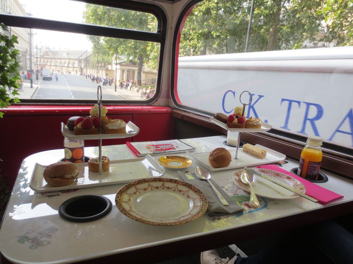 観光バスとは違い、ガイドはありませんが、サンドウィッチやケーキをつまみながら、車窓からのロンドンの街並みを眺めるといった感じです。おしゃべりしながら、我々はとても楽しめました。バスは揺れますので、乗り物酔いする方は、酔い止めを飲んでからのほうがいいと思います。また、この日は天気が良くてバスの中はちょっと暑かったのですが、スタッフの方が冷たいミネラルウオーターを配ったり、扇子を貸してくれたり、いろいろと気を使ってくれたのが印象的でした。