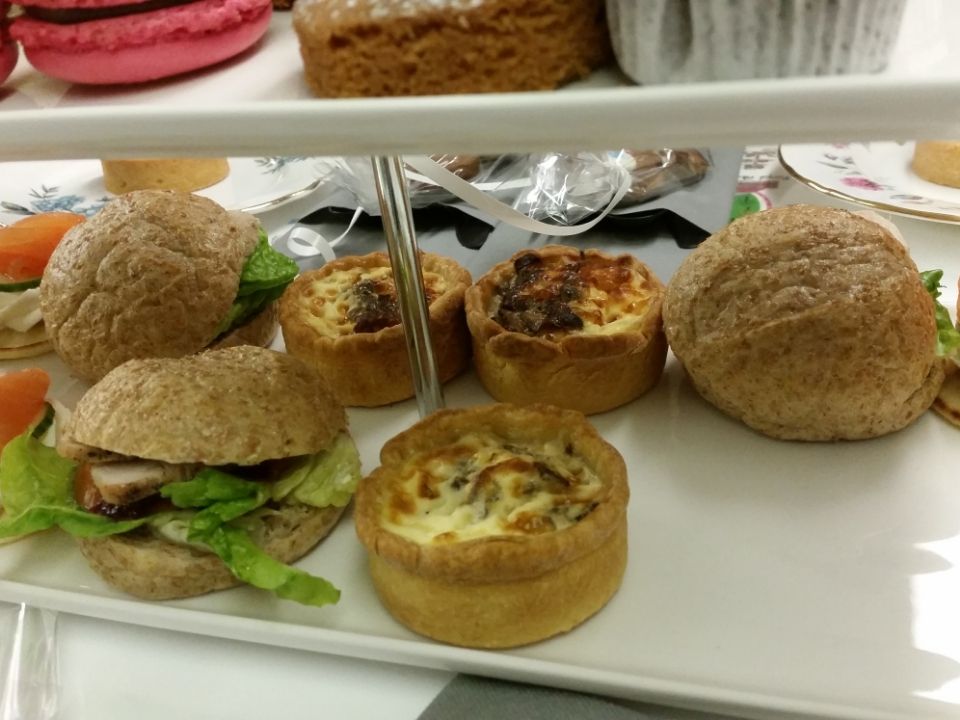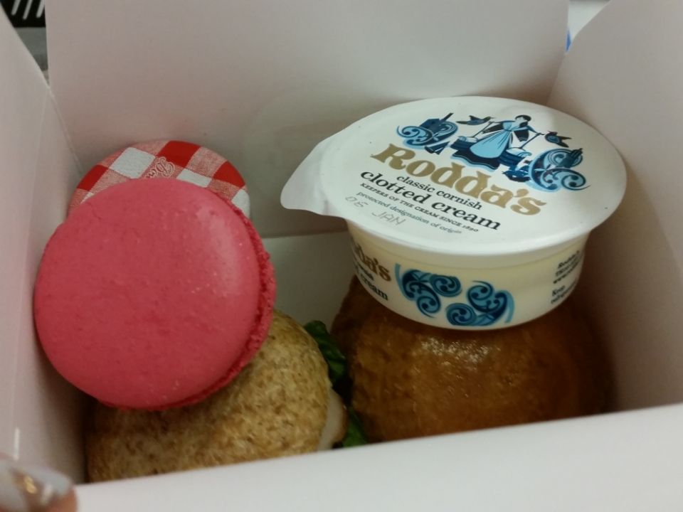 ちゃんと名前で席が決まってるらしく窓際二人掛けを案内され、ワインなどのお酒はいかがですかと係りの人がお客に尋ねて回り(お金を出してその場で注文してる人たちが結構いました)、紅茶やコーヒーがどんどん配られ、それから二人分が盛られた3段重ねのスタンドがやってきました。事前申し込みの際に選択肢があったので一人分はベジタリアンでお願いしたら、チーズにウスターソース味に似たペースト(おそらくploughmans pickleと言うものと思われます、個人的にはヒットで自分用お土産に購入してしまいました)が塗られたものと卵の2種類のサンドでした。普通のは卵、ハム、ポテト?、エビの4種類、どれも大口開けたら2口ぐらいで入るサイズで一人4切れ。スコーンは小ぶりなのが一人一つ、ミニフルーツタルト、ミニエクレア、ミニマカロンがそれぞれ一つずつ。お茶は係りの人がポットをもってまわってくるのですかさずおかわりをお願いします。食べ終わると結構さっさとスタンドは片づけられてしまいました。