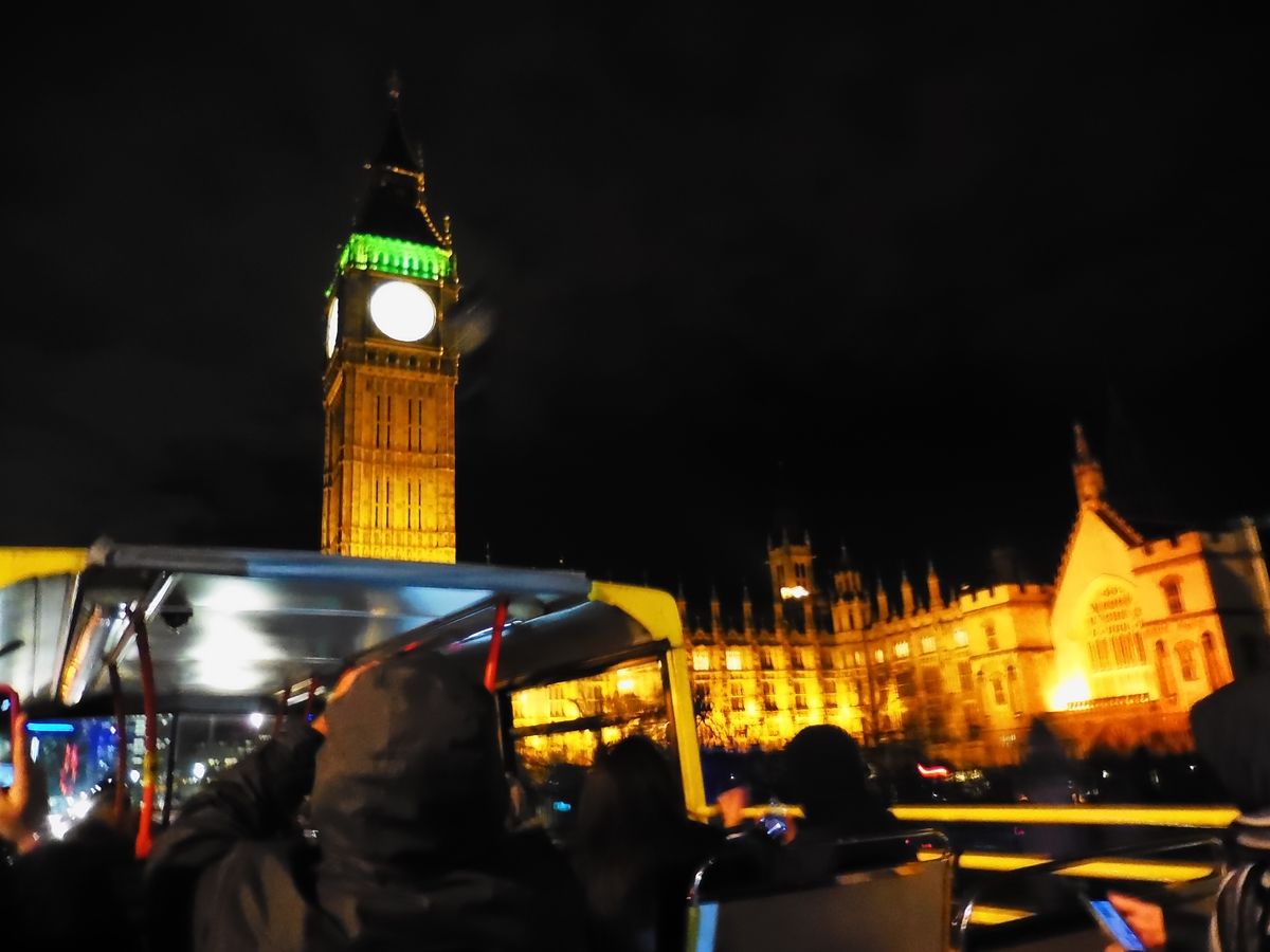 ロンドン到着の夜に参加しました。集合時間少し前に行きましたが、もうたくさんの人が並んでいました。バス2台でみんな2階に乗ろうと思っているようで1階はほぼ誰も乗っていなかったと思います。12月だったので2階だとだんだん寒くなってきて最後のほうは早く降りたくなりましたが、旅の初めに街のいい予習ができたと思います。ライトアップもとてもきれいでした。