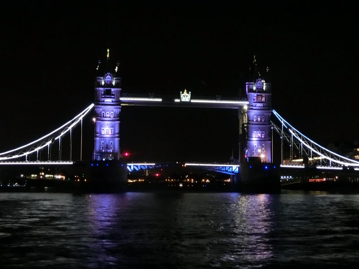 食事は私はスープが美味しかった‥不味いとは思わなかったけれども、日本人好みの味付けと言うわけにはいかない。男性ボーカルが途中チョコレートを配り、私たちにも優しく気遣ってくれました・・歌もいい感じで、ダンスタイムもあり、楽しかったです。船には2階があり、途中、好き好きに2階(デッキ)に上がり、夜の川沿いの風景を堪能しました。ロンドンブリッジは大満足。きれいでした。