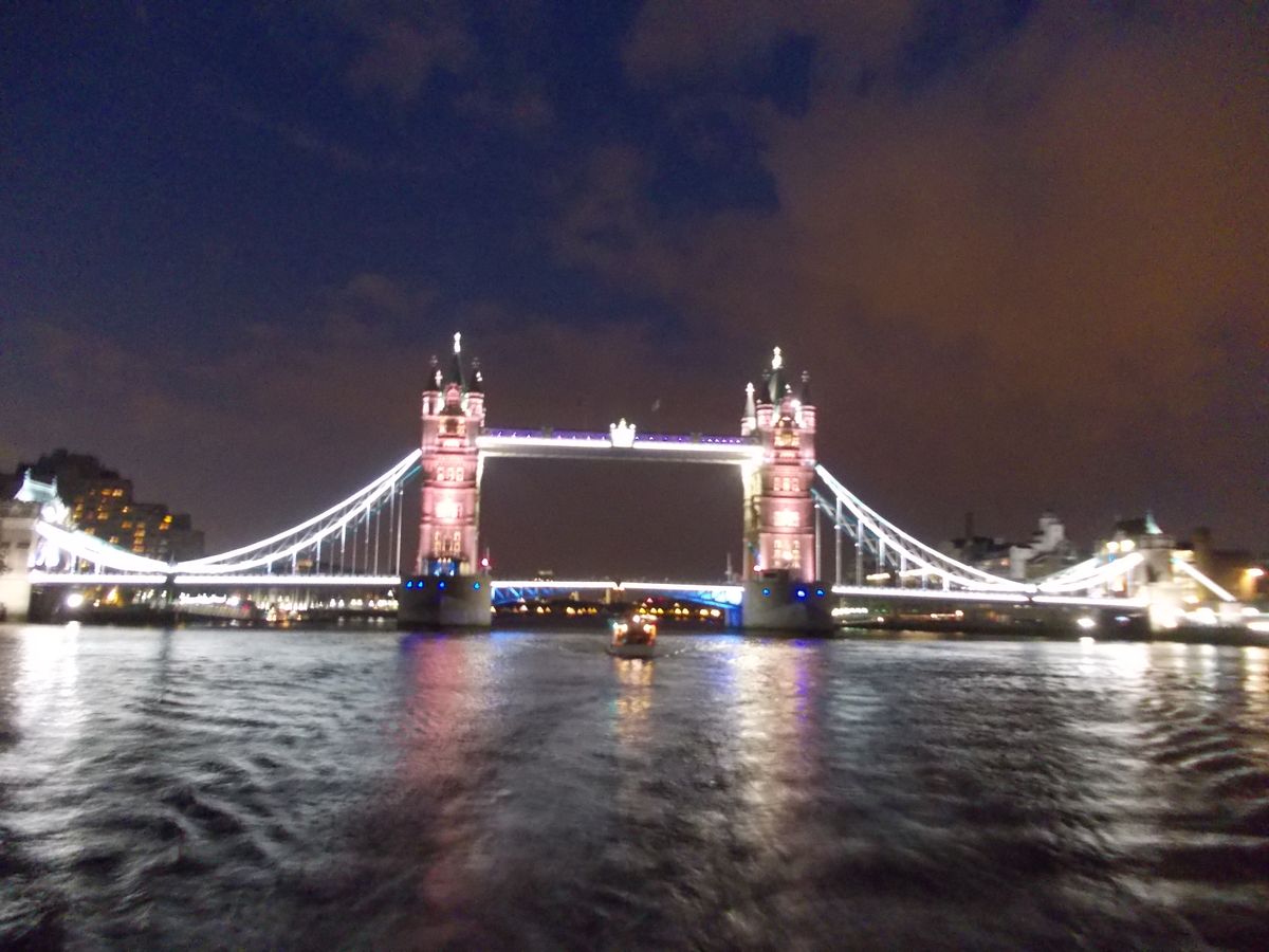 夫婦で参加。二人ともあまりお酒が強くないので、せっかくの豊富なワインリストを活かしきれませんでしたが、眺めの良い座席で夜景を堪能できました。川岸の景色のロンドン塔、ロンドンアイが美しいですが、「橋」自体も美しいので、最前列のエリート席は値打ちアリです。スタッフの対応も丁寧でトイレなどの設備も整っており、良かったです。お料理の味はそこそこ、(ディナークルーズにあまりお料理の内容を求めても仕方ないですが)、でもやはり、メインのお料理にもう少し「豪華さ」が欲しいところで少し辛い採点で★1つマイナス。