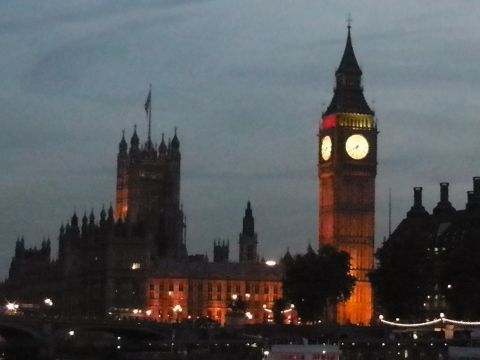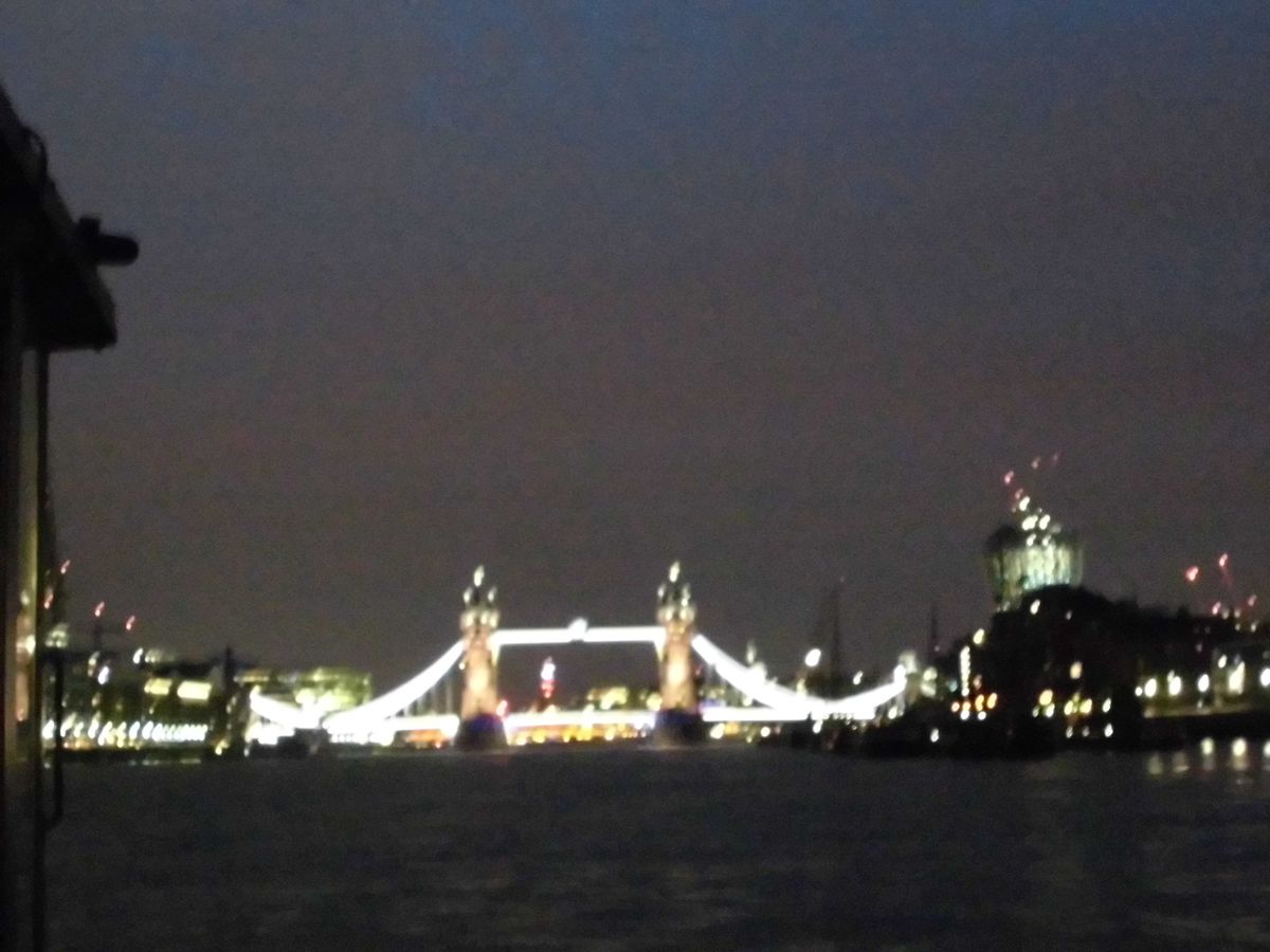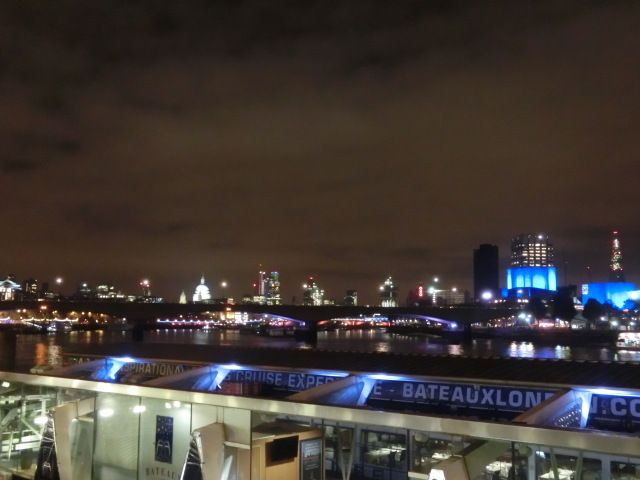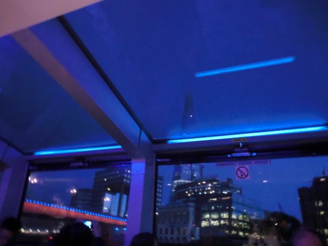 まだ明るい7時半に出発。まず,右岸の近代的建物群,ロンドン・アイ,オクソタワー,シャード,ロンドン市庁舎などを眺め,9時半過ぎて暗くなってから折り返し。今度は反対側の夜景を楽しみながらのクルーズ。