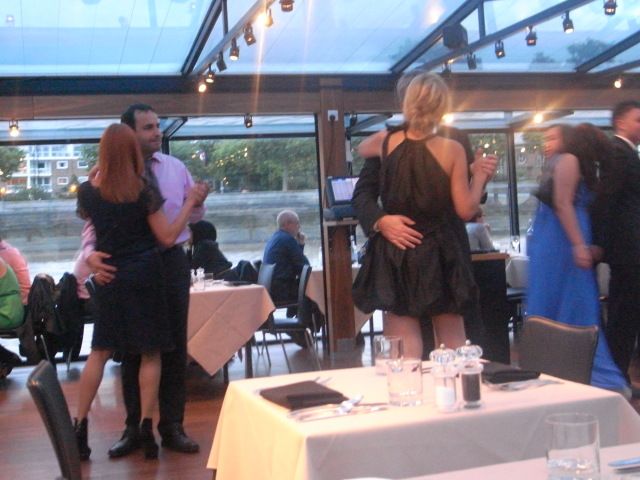 そして、7時10分乗船。ウェルカムシャンペンを持ちながら指定に。席はカップルで向き合うようになっています。残念ながら窓際の席ではありませんでしたが、屋根も一部ガラス張りになっているため外の景色はしっかり楽しめました。7時30分頃になると夕闇もせまり、いよいよ出発。ライトアップされたピッグベンの美しさ、まわりの建物も、中国のようにギンギラギンではなく落ち着いたライトアップでテムズ川の茶色の水も闇に隠され、ロマンチックなディナーの始まりです。エビ・サーモン・野菜の前菜とパンもとても美味しく、有料で頼んだビールもすすみました。他の人達もビールやワインを注文し、だんだんにぎやかになってきた時、女性の歌手が出てきて素敵な歌声を披露してくれました。その後メインの肉料理、デザートがあり料理もおいしかったです。