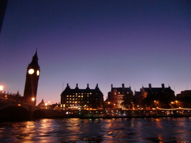 午後7時10分に集合だったのですが、不慣れなロンドン市内なので6時30分ごろにウェストミンスター・ピァ(乗船場所)に行って確かめました。乗船場所は、ウェストミンスター寺院やビッグベンのすぐそばで、集合時刻までウェストミンスターブリッジから夕陽に輝くビッグベンや通り過ぎる人、2階建てバスや独特のかわいらしい形をしたタクシーなどをながめて時間をすごしました。