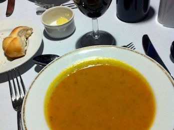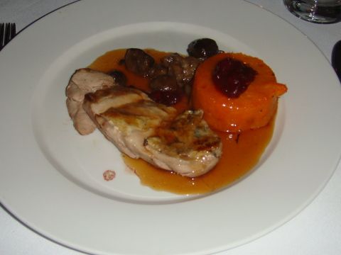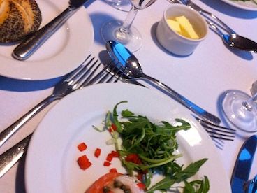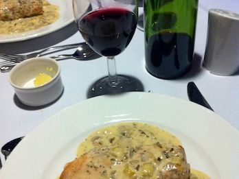 船内ではゆっくりのペースで前菜,スープ,メイン,デザート,コーヒーorティー。ワインのハーフボトルを別に注文(これは結局お代の請求はなかった)。船の中の料理だから,と思っていたが温かく,なかなか美味しかった。量は多すぎるほど,かな。