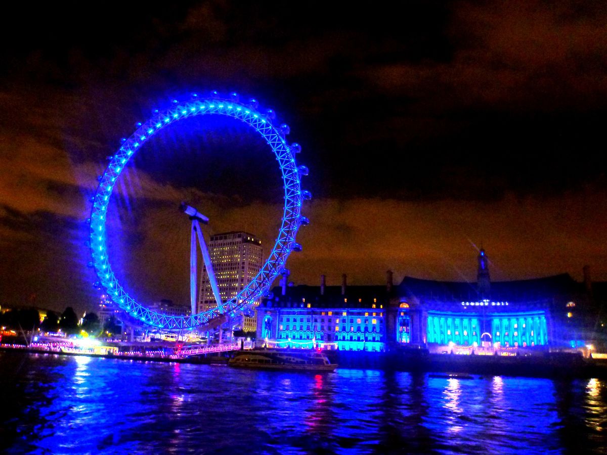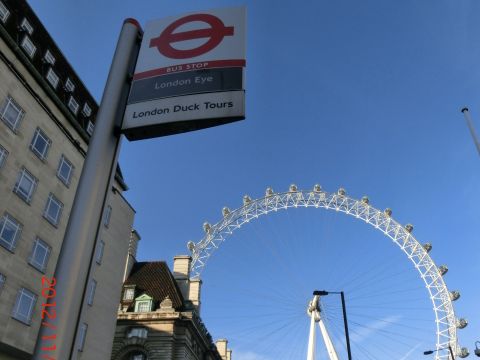 船着場に着く頃,目の前にブルーの鮮やかなロンドン・アイ。うわー,大きい,きれい!