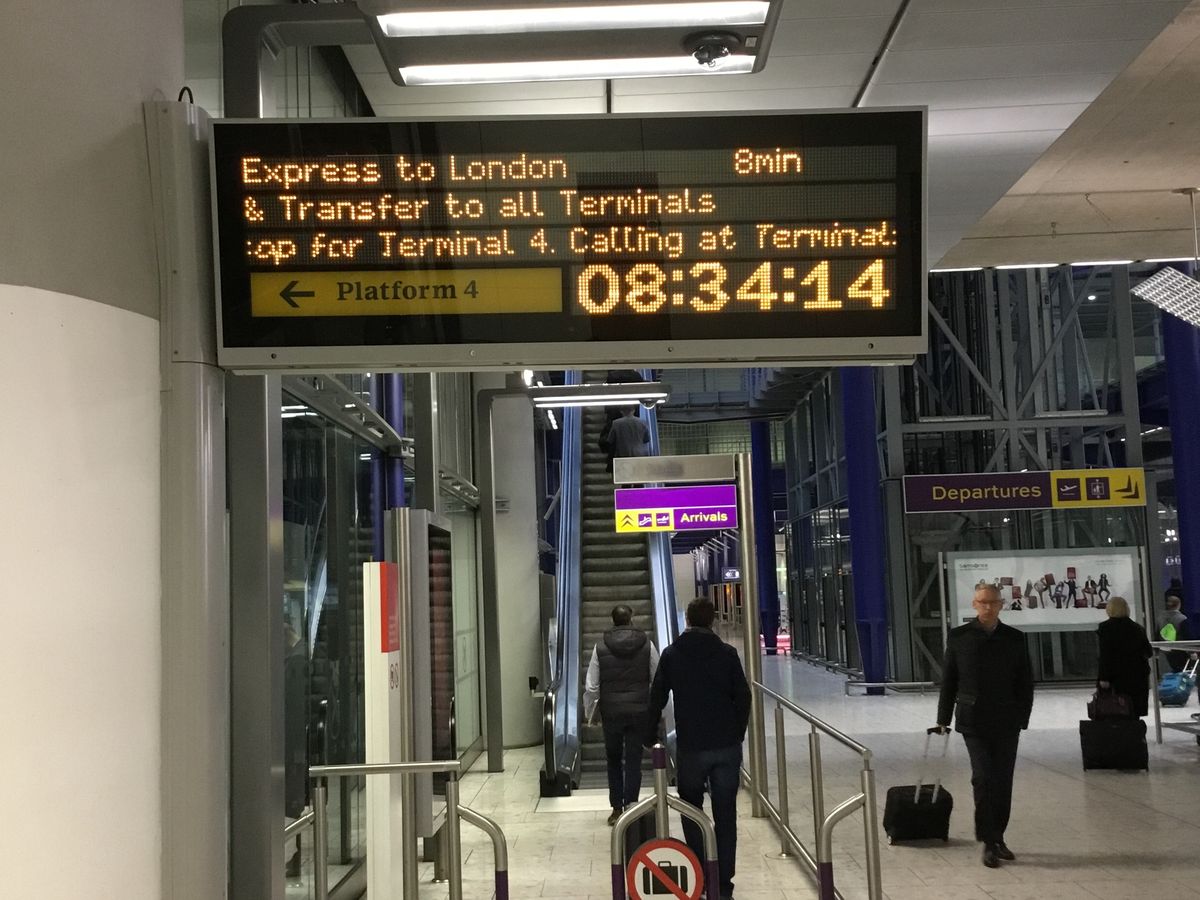 ・Paddington行きの列車は「Express to London」と電光掲示板に記載されている所で、Paddington行きとは記載されていない(少なくとも私は気付けませんでした。。。添付の写真はターミナル5ですが、ご参考まで)