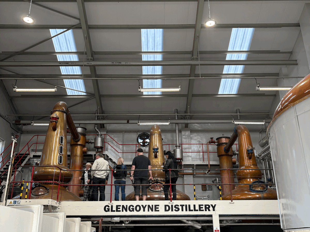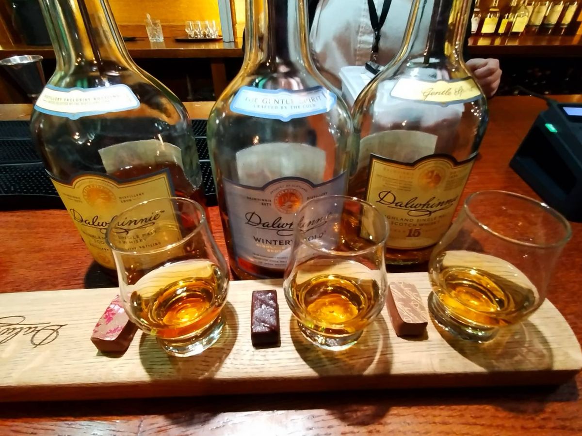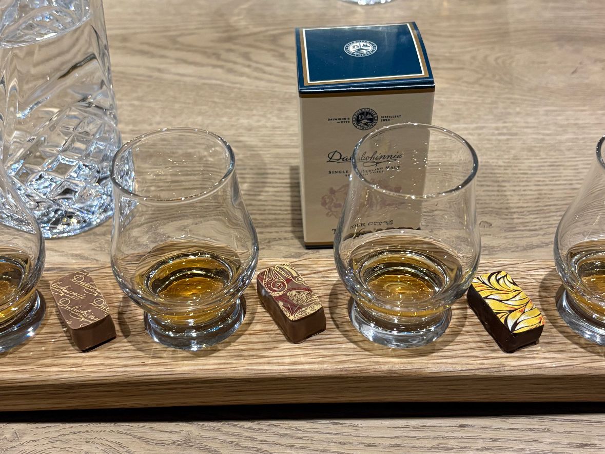 〇1時間半くらい走って(途中、スターリング城近くで記念撮影タイムあり)、11時頃にグレンゴイン蒸留所(写真2)に到着。蒸留所内はメンテ中とのことで、外見のみのガイドツアー。(返金などはありません。)テイスティングは、10年と15年(写真3)とウィスキーカクテル(写真4)の3種。このカクテルがとても美味しいのですが、度数が高いのか結構酔っぱらいます。ショップではツアー参加者割引がありますが、物価高と円安で日本の2倍の価格!!ミニチュアボトルセットとロゴ入りテイスティンググラスのみ購入。