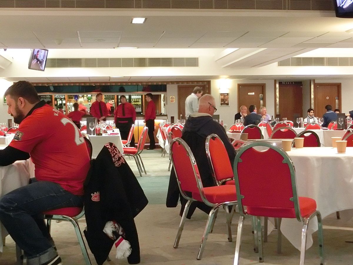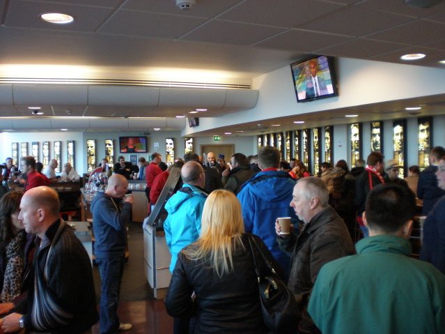 チケット交換後、徒歩5分くらいの距離にあるExective用エントランスから入り、座席があるフロアまで上がり、上がってすぐ側のクロークでチケットを見せるとパンフレットとコーヒーを貰えます(言わないとくれないので注意です!私たちは後で貰いに行きました。)その後、試合を待つ間ラウンジが利用でき、有料ですがラウンジ内のバーやレストラン(ビュッフェ)も利用できます。(早めに行かないと開始45分前くらいには満席になります)ラウンジは座席と繋がって便利ですし、ラウンジ内にお手洗いもあり、一般席のような行列を味わうことがありません。ハーフタイムも試合後もラウンジ内でコーヒーと紅茶が配られます。