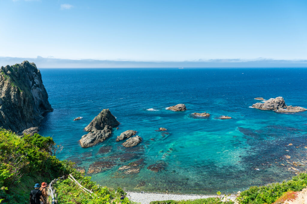 積丹半島の美しい海岸線に位置する「神威岬」は、美しさもまた訪れる人々を魅了します。深いコバルトブルーの海は見るものに深い感動を与えます。神威岬先端までは急な斜面や岬の稜線に沿って爽やかな風を受けつつ約片道30分のハイキングとなりますが、その道のりもまた一つの楽しみと言えるでしょう。