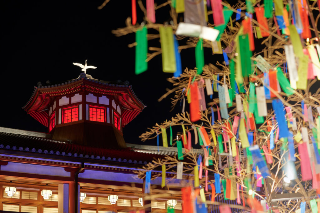 食事の後は、近くにある写真映えスポット「道後別館 飛鳥乃湯泉中庭」へ。ここは、写真家の「蜷川実花さん」が撮影した230枚もの美しい花の写真が床一面に設置されているスポットで、夜はライトアップされて更に美しい風景を楽しむことができます。ただし、このスポットは2024年までの期間限定なので、早めに訪れてみましょう。