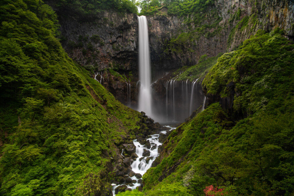 観爆台まではエレベーターで登れ、間近で見る滝つぼは迫力満点。爆音とともに水しぶきが弾ける豪快な姿が見られます。また、5月には見事な新緑が広がり、滝と緑のコントラストが美しい風景も必見です。夕方の華厳の滝は、一日の疲れを癒す穏やかな時間を提供してくれます。