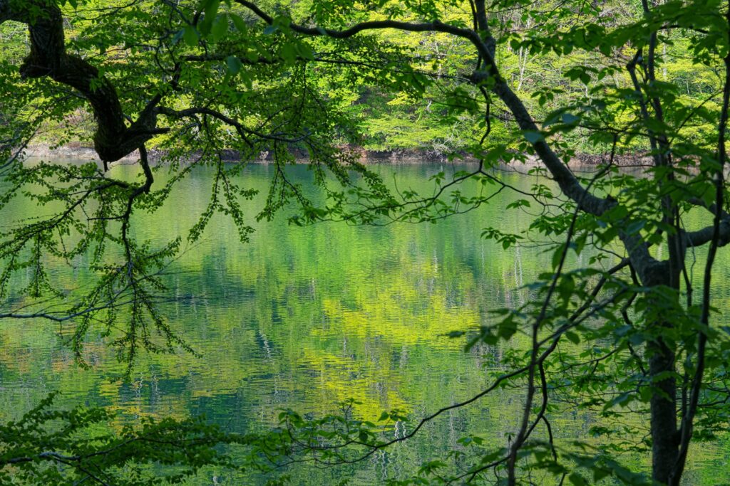 沸壺の池は、白神山地の十二湖の一つで、エメラルドグリーンの水面が特徴です。透明度が高く、まるで宝石のような輝きを放っています。池の周囲にはブナの自然林が広がり、森林浴を楽しむのにも最適なスポットです。