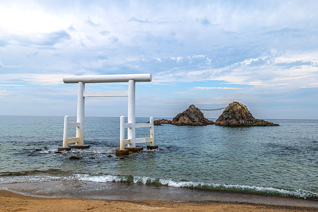 この夫婦岩は、海岸から約150mの海中にそびえ立ち、それぞれ高さ11.2mと11.8mあります。特に夏至の頃には、夫婦岩の間に沈む夕陽が美しく、訪れる人々を魅了します。福岡の1月観光にもおすすめのスポットです。