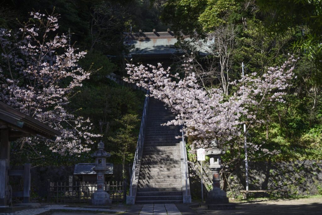 鳥居をくぐると、社殿へと続く石段の脇に美しい玉縄桜が広がります。歴史ある神社の雰囲気とともに、早春の桜を楽しんでみませんか。