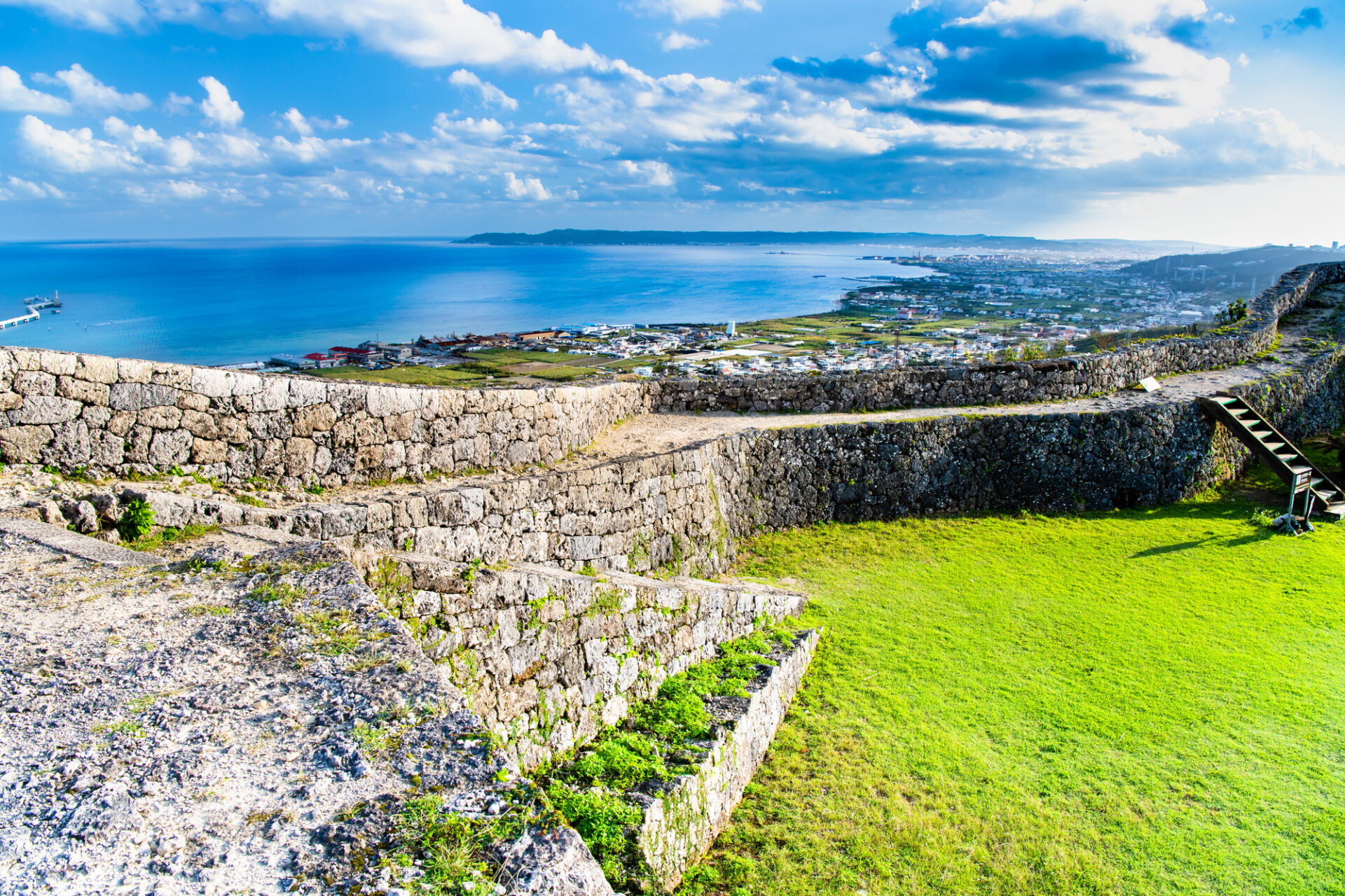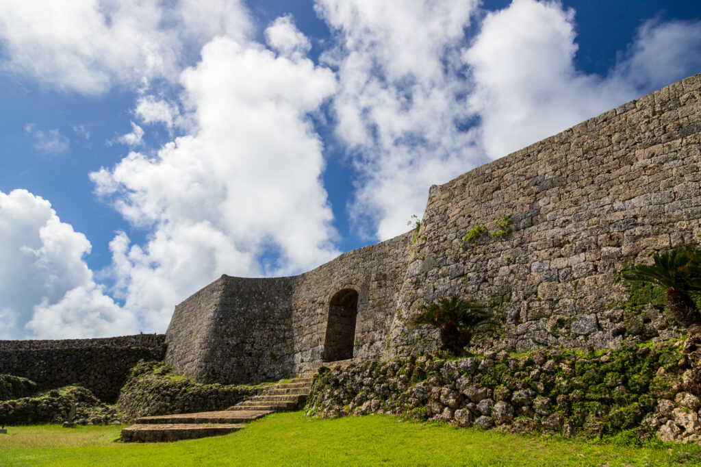 沖縄の世界遺産として知られる中城城跡は、中城村と北中城村にまたがるスポットで、東北と南西にほぼ一直線に伸びた石灰岩丘陵上に立地する山城を指します。標高は150m〜170mと高さがあり、南東側は15m以上の断崖、北西側は勾配のきつい傾斜面となっているため、いかに攻められにくい城であったかが窺えます。
