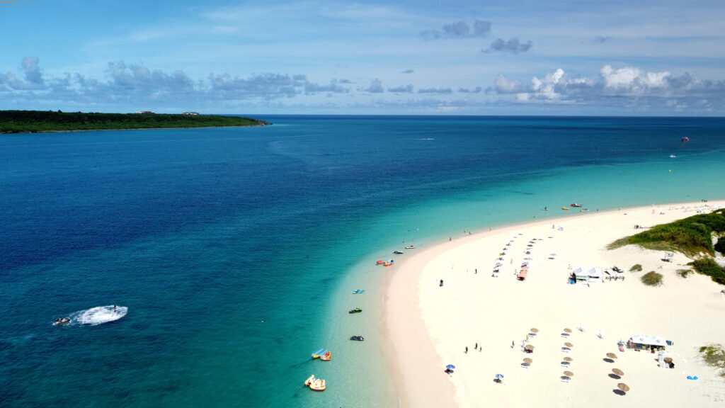 瀬底ビーチは、沖縄本島北部にある離島「瀬底島」の西海岸にある天然ビーチです。海水浴はもちろん、ジェットスキーなどマリンスポーツも楽しめます。