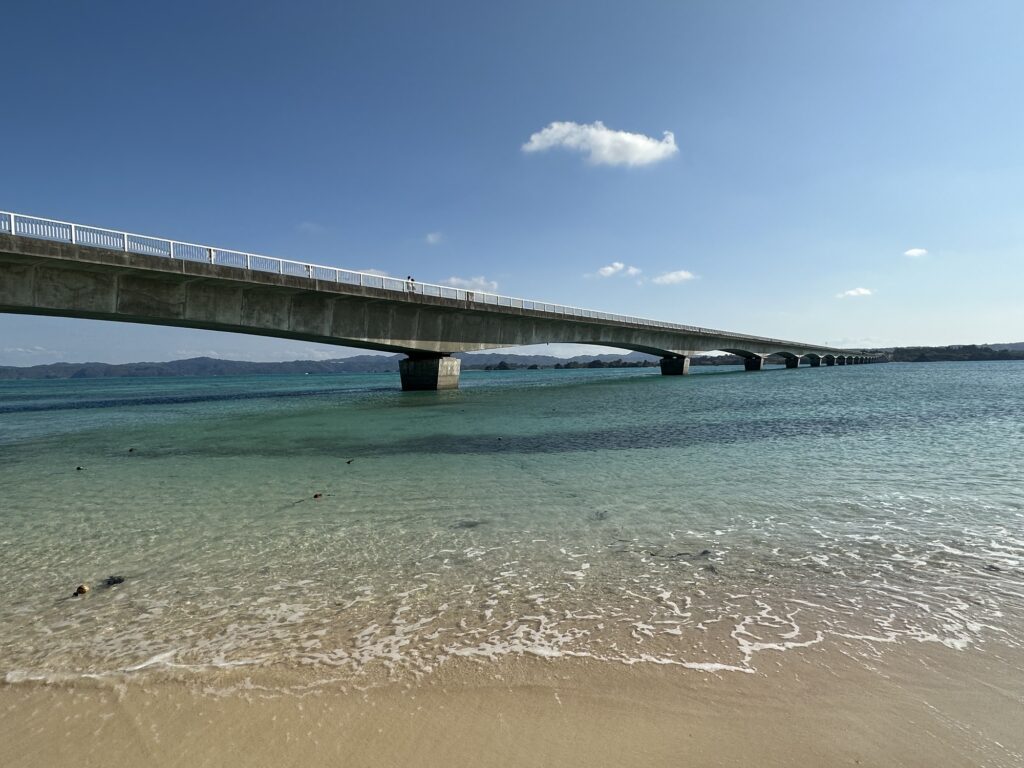 沖縄美ら海水族館から、車で北上したところにあるのが古宇利大橋です。この橋は沖縄本島と古宇利島をつなぐ橋で、沖縄の絶景ポイントとして近年の人気は急上昇!橋の両側に広がるエメラルドグリーンの海の色は、「ちゅらうみ」と表現するにふさわしい光景です。