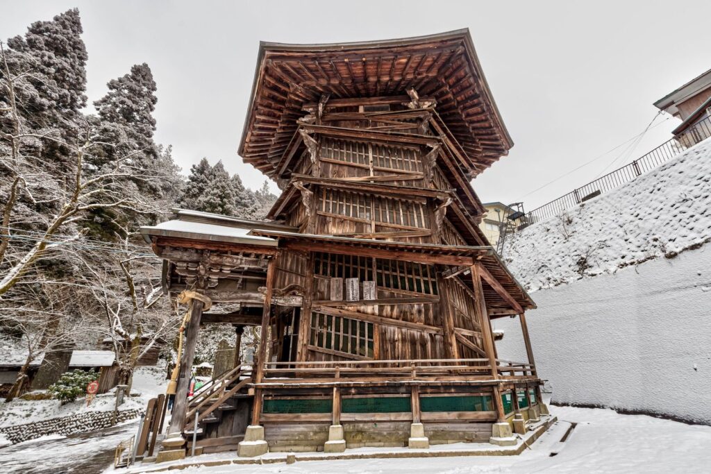 会津さざえ堂は、福島県会津若松市に位置する独特な建築物です。1796年に建立されたこの堂は、二重螺旋構造が特徴で、上りと下りが別々の通路になっています。参拝者は一方通行で堂内を巡ることができ、三十三観音像を拝むことができますよ。