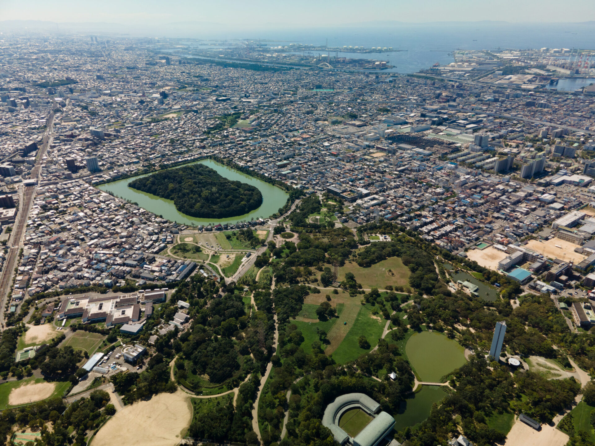 地上からはその全容を見ることができない仁徳天皇陵古墳ですが、南海高野線「堺東」駅の目の前にある堺市役所の21階にある無料展望ロビーからは、都会の真ん中に森のようにたたずむ古墳の様子を見ることができます。また、地上から直接仁徳天皇陵古墳を見ることができるのは、中央部にある拝所のみです。その壮大さと歴史の重みを感じることができる場所、それが仁徳天皇陵古墳です。