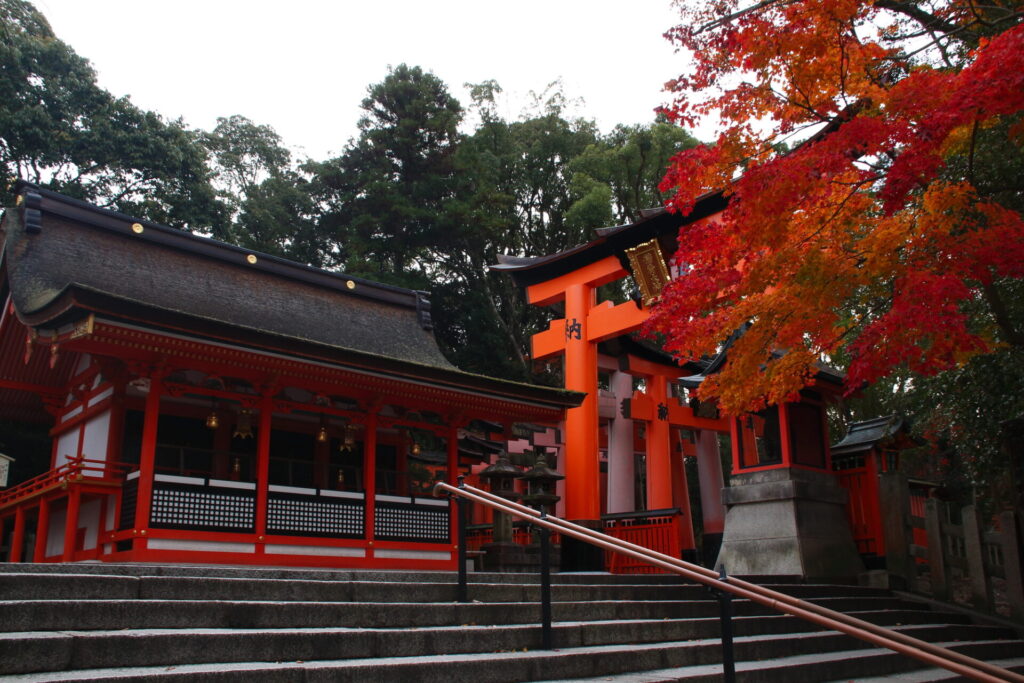紅葉の時期になると、境内は赤や黄色に染まり、まるで絵画のような美しさを魅せてくれます。特に、千本鳥居を背景にした紅葉は絶景で、訪れた人々はその美しさに息をのむでしょう。