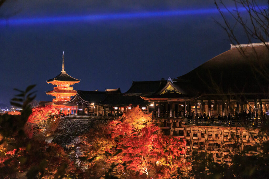 また、清水寺の本尊である十二面千手観音菩薩立像の慈悲を表す青いサーチライト「観音慈悲光」が京都の夜空を照らす様子は、まさに新たな風物詩となっています。このライトアップは、紅葉の美しさだけでなく、清水寺の荘厳さを一層際立たせる効果もあります。