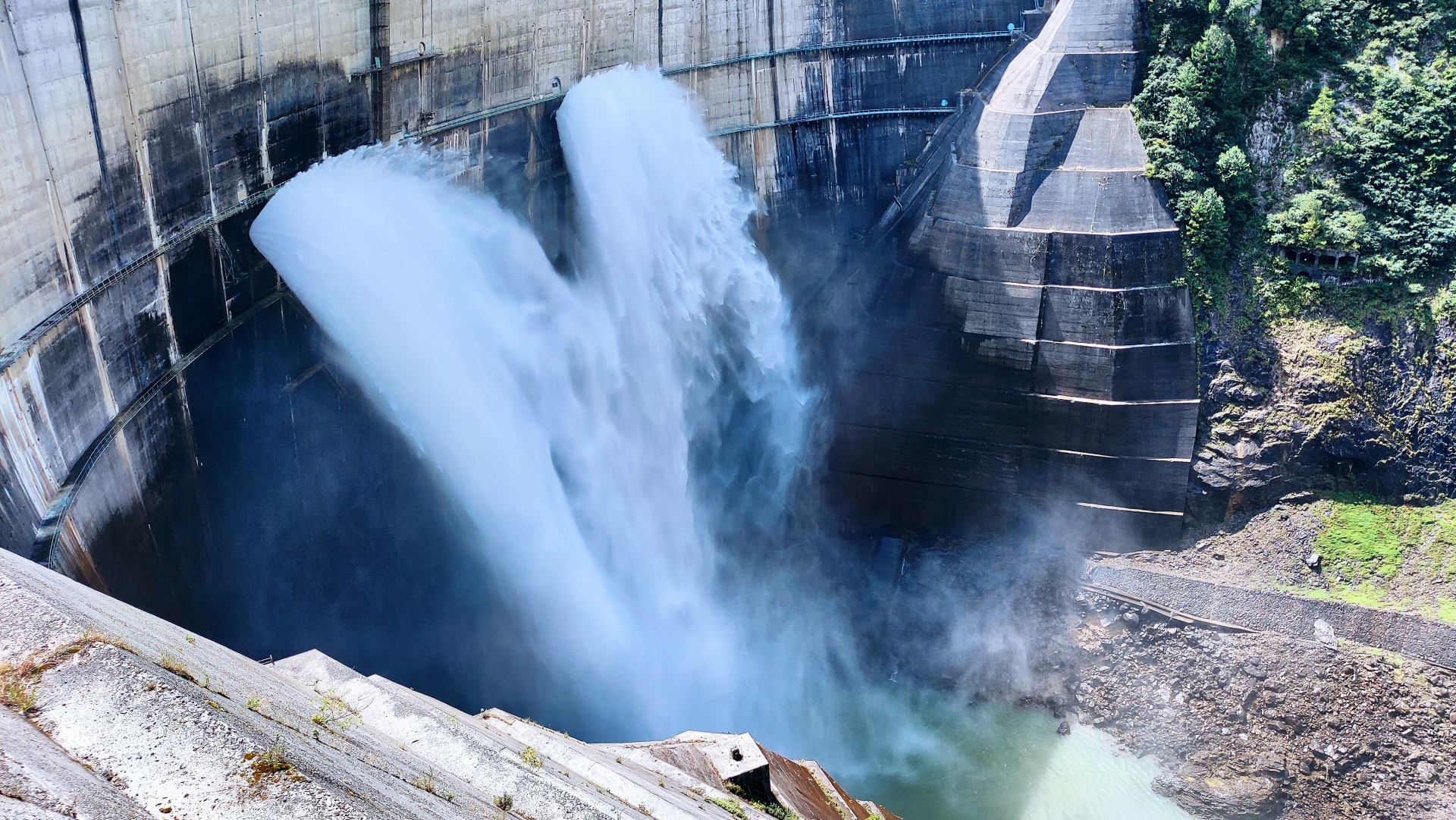 黒部ダムの観光放水は必見です!毎秒10トン以上の水が日本一の高さから噴き上げる様子は圧巻です。展望台や外階段、新展望広場からの眺めは絶好のビューポイントです。特にレインボーテラスでは、晴れた日に美しい虹が見られることもあります。