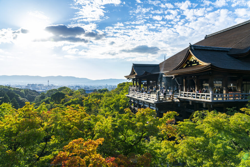 本堂は「清水の舞台」と呼ばれる、せり出すような独特の建て方が特徴。清水の舞台から飛び降りる……という、有名なことわざは、この建造物から生まれました。秋にはもみじ、夏には新緑。さまざまな四季折々の光景を楽しめることで、観光客からも人気が高い世界遺産として知られます。