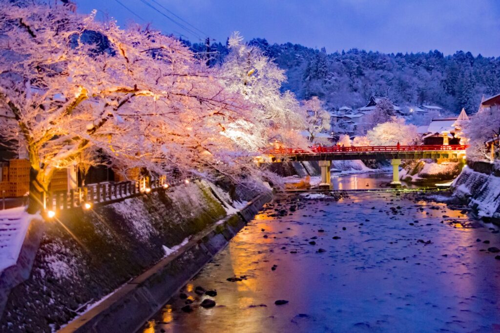 また、高山城築城の頃に作られた「江名子川」沿いの散歩道もおすすめです。周辺は京文化の影響を強く受け、歌舞伎にちなんだ名前の橋や横丁があり、どこか懐かしい雰囲気が漂います。春には川沿いに桜が咲き、夕暮れになると周辺がライトアップされ、美しい夜桜を見ることができます。夜の散策を楽しみながら、高山の歴史や文化を感じてみませんか。