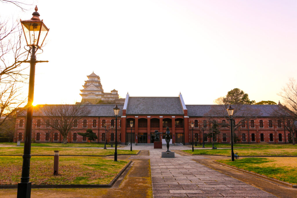 夕方の姫路市立美術館は、特別な魅力を放っています。その建物は旧陸軍が使用していた煉瓦造りで、レトロな雰囲気が漂っています。美術館の東側入り口から見る姫路城は、赤煉瓦越しに見上げるアングルが特に有名で、その美しさは姫路城十景にも選定されています。