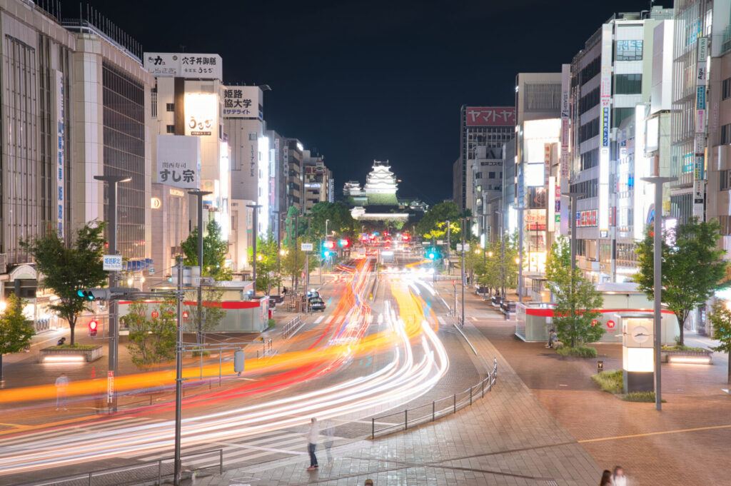 姫路駅周辺は、夜になると特別な雰囲気に包まれます。特に四季によってかわる姫路城のライトアップは必見。駅の北側に整備された眺望デッキ「キャッスルビュー」からは、大手前通りの向こうに照らされる姫路城を真正面から一望できます。まるで額縁の中に収まる1枚の絵のような美しさは、旅の最後の思い出にふさわしい風景といえるでしょう。