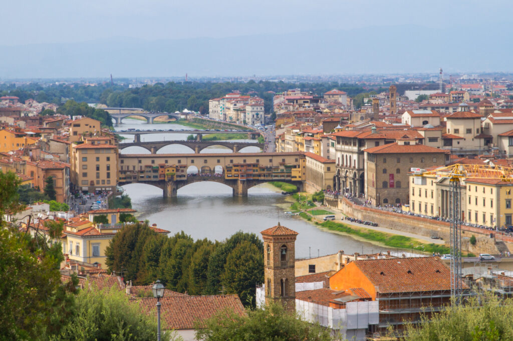 次に、「ヴェッキオ橋」。この橋の上には、色とりどりの店舗が並び、歩きながらショッピングを楽しむことができます。そして、「ミケランジェロ広場」からは、フィレンツェの街並みを一望できます。