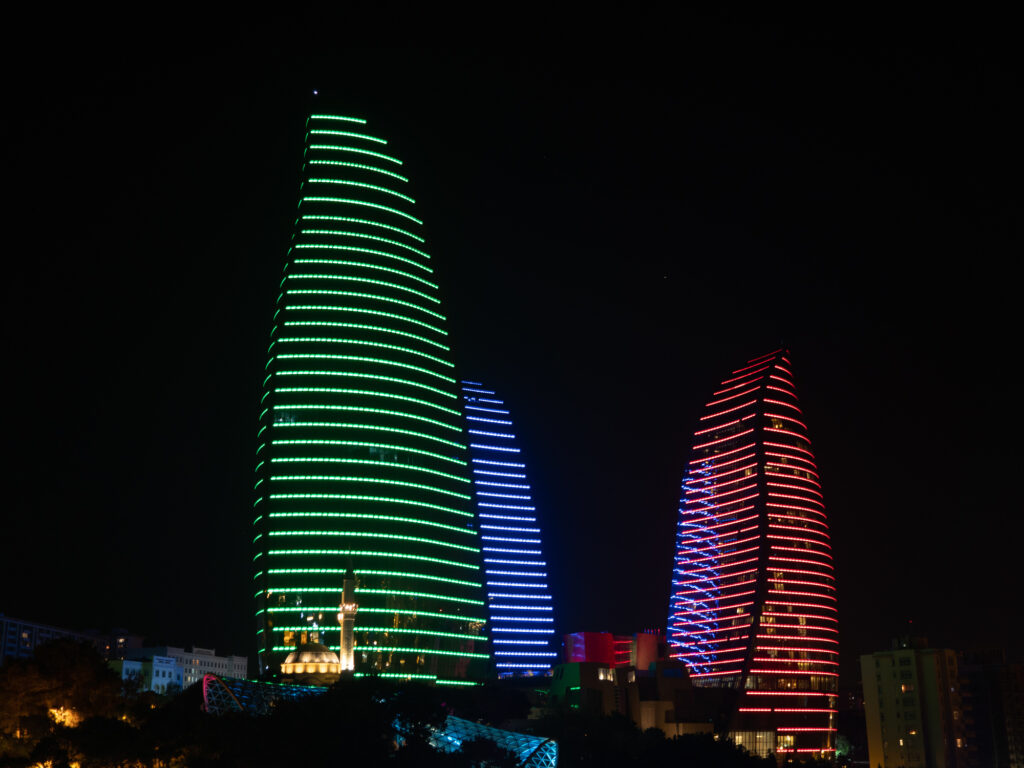 アゼルバイジャンの首都、バクーにそびえ立つフレイムタワーは、その名の通り炎をイメージしたデザインが特徴的な建築物です。その高さは190メートルにも及び、バクーの街並みを一望できる絶景スポットとしても知られています。また、夜になるとタワー全体がライトアップされ、まるで炎が舞い上がっているかのような幻想的な光景を見ることができます。