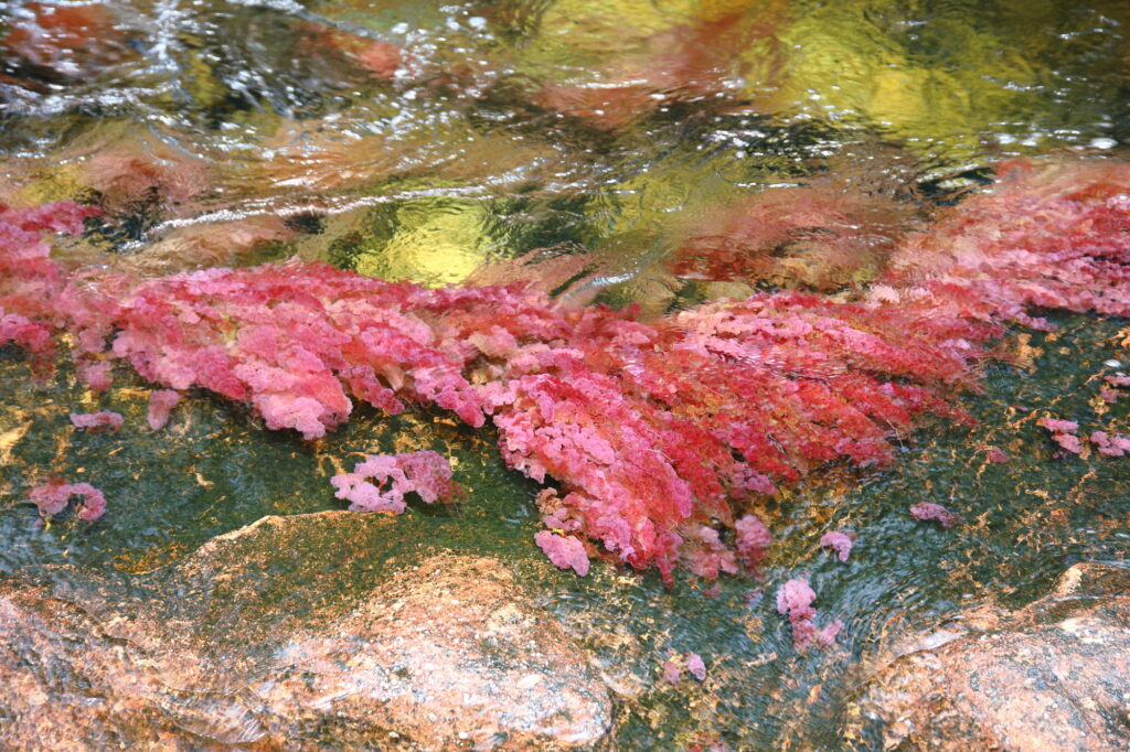 キャノ・クリスタレスは、コロンビアのシエラ・デ・ラ・マカレナ国立公園内に位置する、世界でも類を見ない美しい川です。その美しさから「五色の川」や「液体虹」とも称され、その名の通り、水面は青、黄、緑、黒、赤の5色に輝きます。これは川底の特殊な藻類が季節や天候によって色を変えるためで、特に雨季の7月から11月にかけて最も色鮮やかになります。